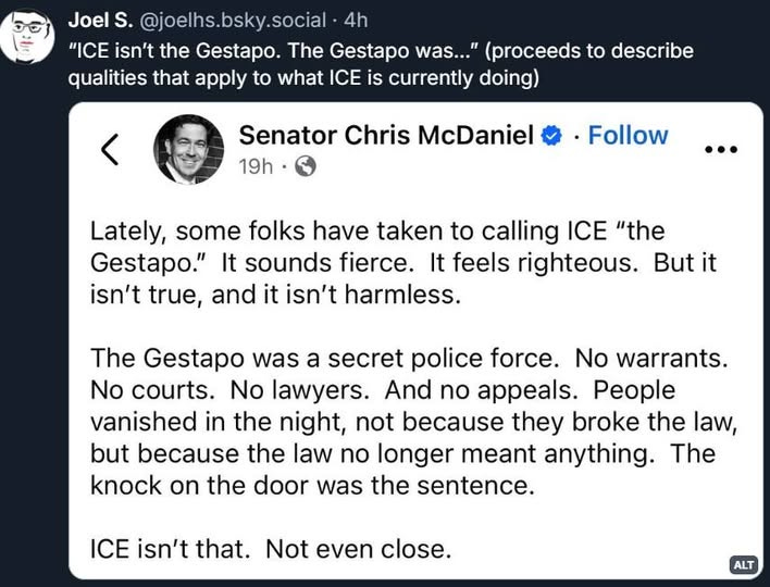 Those who are on the side of ICE/this administration are demonstrating to us that they can’t perceive the danger of this lost guardrail for whatever reason. The reason could be ideological. It could be that they actually want a totalitarian government. It could be that they are just plain evil racists who get off on the suffering of minorities and think it won’t ever affect them. It honestly doesn’t matter. The point is that we can’t trust their judgement.
